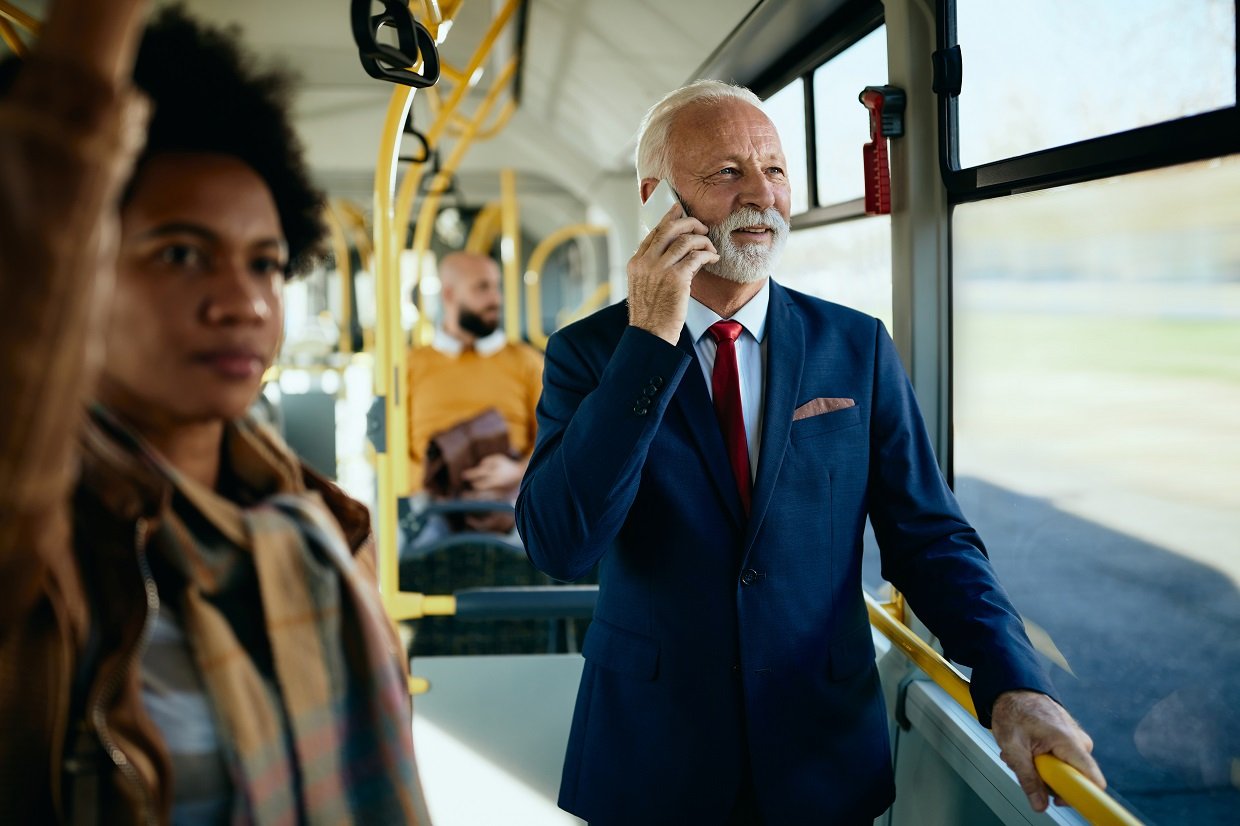 Virtual Tour Happy senior businessman communicating over mobile phone while commuting to work by public transport. All Other
